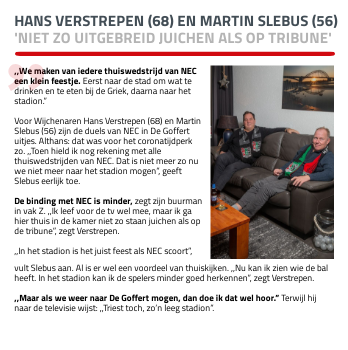,,We maken van iedere thuiswedstrijd van NEC een klein feestje. Eerst naar de stad om wat te drinken en te eten bij de Griek, daarna naar het stadion.” Voor Wijchenaren Hans Verstrepen (68) en Martin Slebus (56) zijn de duels van NEC in De Goffert uitjes. Althans: dat was voor het coronatijdperk zo. ,,Toen hield ik nog rekening met alle thuiswedstrijden van NEC. Dat is niet meer zo nu we niet meer naar het stadion mogen”, geeft Slebus eerlijk toe. De binding met NEC is minder, zegt zijn buurman in vak Z. ,,Ik leef voor de tv wel mee, maar ik ga hier thuis in de kamer niet zo staan juichen als op de tribune”, zegt Verstrepen. ,,In het stadion is het juist feest als NEC scoort”,