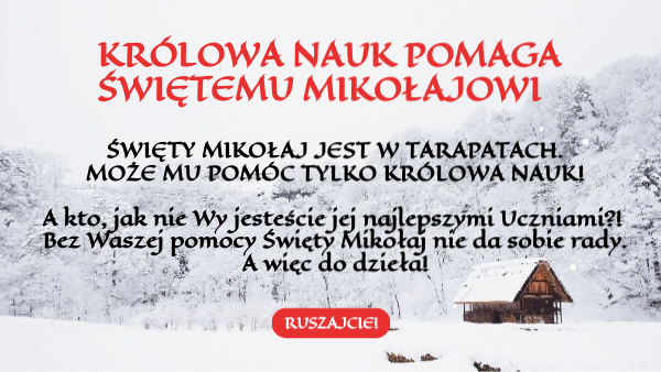 ŚWIĘTY MIKOŁAJ JEST W TARAPATACH. MOŻE MU POMÓC TYLKO KRÓLOWA NAUK! A kto, jak nie Wy jesteście jej najlepszymi Uczniami?! Bez Waszej pomocy Święty Mikołaj nie da sobie rady. A więc do dzieła!