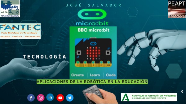 Tras la realización de un curso en el Aula Virtual de Formación desde el CEP de Málaga, creo conveniente compartir de modo totalmente altruista y gratuito entre profesorado y alumnado estos contenidos mediante este medio tecnológico, sin que queden en el olvido para la comunidad educativa, dándole continuidad en el aula en promoción de las Tecnologías Educativas que parten de un profesorado inquieto en su labor de transmitir conocimientos al alumnado. Mis agradecimientos por su divulgación a APTA, PEAPT, MICROBIT, ROBONAUTAS, CEPMA y a todo el profesorado de Tecnología. José Salvador Chamorro Fernández.