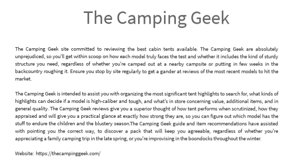 The Camping Geek site committed to reviewing the best cabin tents available. The Camping Geek are absolutely unprejudiced, so you'll get within scoop on how each model truly faces the test and whether it includes the kind of sturdy structure you need, regardless of whether you're camped out at a nearby campsite or putting in few weeks in the backcountry roughing it. Ensure you stop by site regularly to get a gander at reviews of the most recent models to hit the market. The Camping Geek is intended to assist you with organizing the most significant tent highlights to search for, what kinds of highlights can decide if a model is high-caliber and tough, and what's in store concerning value, additional items, and in general quality. The Camping Geek reviews give you a superior thought of how tent performs when scrutinized, how they appraised and will give you a practical glance at exactly how strong they are, so you can figure out which model has the stuff to endure the children and the blustery season.The Camping Geek guide and item recommendations have assisted with pointing you the correct way, to discover a pack that will keep you agreeable, regardless of whether you're appreciating a family camping trip in the late spring, or you're improvising in the boondocks throughout the winter. Website: https://thecampinggeek.com/