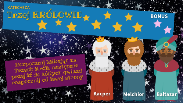 Rozpocznij klikając na Trzech Króli, następnie przejdź do żółtych gwiazdrozpocznij od lewej strony
