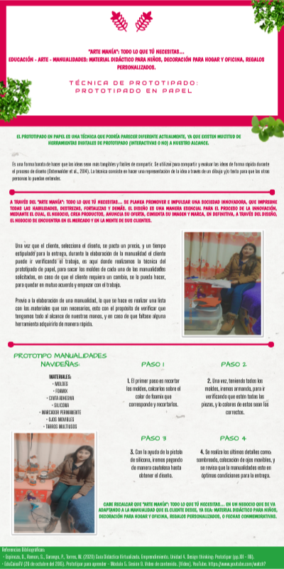 Una vez que el cliente, selecciona el diseño, se pacta un precio, y un tiempo estipulado para la entrega, durante la elaboración de la manualidad el cliente puede ir verificando el trabajo, es aquí donde realizamos la técnica del prototipado de papel, para sacar los moldes de cada una de las manualidades solicitadas, en caso de que el cliente requiera un cambio, se lo pueda hacer, para quedar en mutuo acuerdo y empezar con el trabajo.Previo a la elaboración de una manualidad, lo que se hace es realizar una lista con los materiales que son necesarios, esto con el propósito de verificar que tengamos todo al alcance de nuestras manos, y en caso de que faltase alguna herramienta adquirirlo de manera rápida.