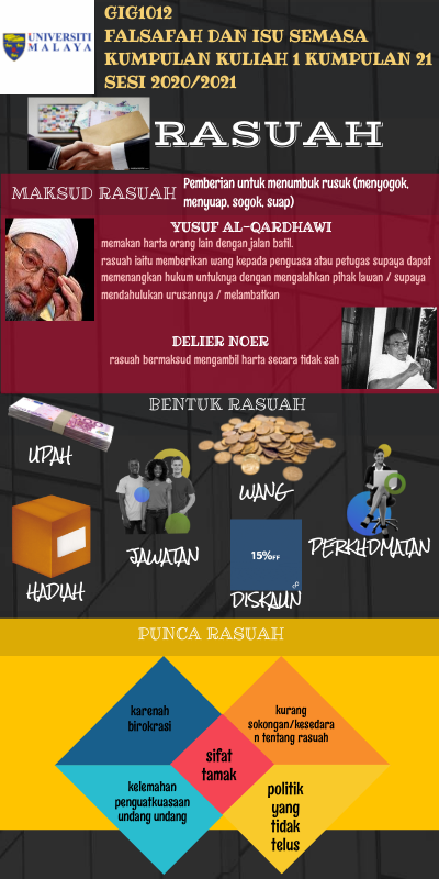 Suruhanjaya Pencegahan Rasuah Malaysia - APA YANG DIMAKSUDKAN DENGAN RASUAH? (2016). Retrieved December 22, 2020, from Sprm.gov.my website: https://www.sprm.gov.my/hubungi-kami/sprm-negeri/196-info-rasuah/1007-apa-yang-anda-tahu-mengenai-rasuah Biani Mawal. (2019, September 21). GEJALA RASUAH : MAKSUD, PUNCA, KESAN NEGATIF DAN CARA MENANGANINYA. Retrieved December 22, 2020, from Slideshare.net website: https://www.slideshare.net/BIANIMAWAL/gejala-rasuah-maksud-punca-kesan-negatif-dan-cara-menanganinya Amar. (2017, April 7). KESIMPULAN. Retrieved December 22, 2020, from Blogspot.com website: http://amardsikuim.blogspot.com/2017/04/kesimpulan.html