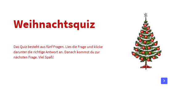 Ich hoffe, dir hat das kleine Weihnachtsquiz Spaß gemacht!Ich wünsche dir und deiner Familie frohe Weihnachten und paar schöne Feiertage.Viele Grüße M. Althaus