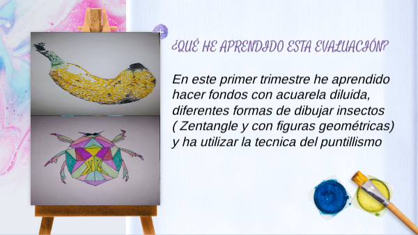 En este primer trimestre he aprendido hacer fondos con acuarela diluida, diferentes formas de dibujar insectos ( Zentangle y con figuras geométricas) y ha utilizar la tecnica del puntillismo