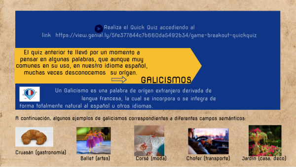 Un Galicismo es una palabra de orígen extranjero derivada de la lengua francesa, la cual se incorpora o se integra de forma totalmente natural al español u otros idiomas.