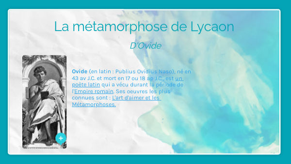 Ovide (en latin : Publius Ovidius Naso), né en 43 av J.C. et mort en 17 ou 18 ap J.C., est un poète latin qui a vécu durant la période de l'Empire romain. Ses oeuvres les plus connues sont : L'art d'aimer et les Métamorphoses.