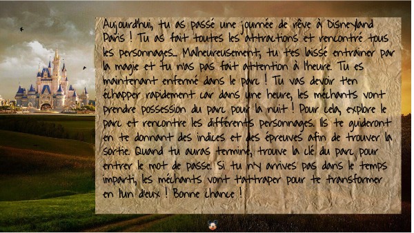 Aujourd’hui, tu as passé une journée de rêve à Disneyland Paris ! Tu as fait toutes les attractions et rencontré tous les personnages… Malheureusement, tu t’es laissé entrainer par la magie et tu n’as pas fait attention à l’heure. Tu es maintenant enfermé dans le parc ! Tu vas devoir t’en échapper rapidement car dans une heure, les méchants vont prendre possession du parc pour la nuit ! Pour cela, explore le parc et rencontre les différents personnages. Ils te guideront en te donnant des indices et des épreuves afin de trouver la sortie. Quand tu auras terminé, trouve la clé du parc pour entrer le mot de passe. Si tu n’y arrives pas dans le temps imparti, les méchants vont t’attraper pour te transformer en l’un d’eux ! Bonne chance !