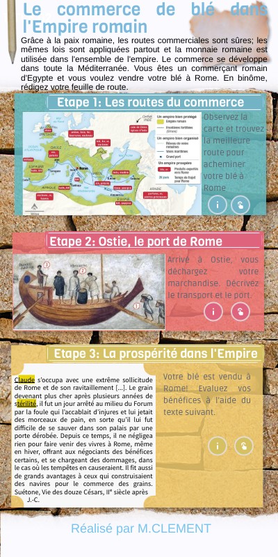 Grâce à la paix romaine, les routes commerciales sont sûres; les mêmes lois sont appliquées partout et la monnaie romaine est utilisée dans l'ensemble de l'empire. Le commerce se développe dans toute la Méditerranée. Vous êtes un commerçant romain d'Egypte et vous voulez vendre votre blé à Rome. En binôme, rédigez votre feuille de route.