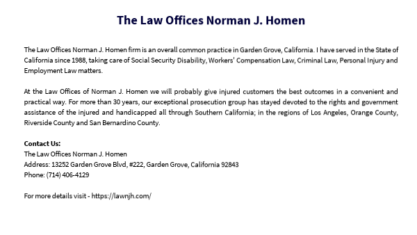 The Law Offices Norman J. Homen firm is an overall common practice in Garden Grove, California. I have served in the State of California since 1988, taking care of Social Security Disability, Workers' Compensation Law, Criminal Law, Personal Injury and Employment Law matters. At the Law Offices of Norman J. Homen we will probably give injured customers the best outcomes in a convenient and practical way. For more than 30 years, our exceptional prosecution group has stayed devoted to the rights and government assistance of the injured and handicapped all through Southern California; in the regions of Los Angeles, Orange County, Riverside County and San Bernardino County. Contact Us: The Law Offices Norman J. Homen Address: 13252 Garden Grove Blvd, #222, Garden Grove, California 92843 Phone: (714) 406-4129 For more details visit - https://lawnjh.com/