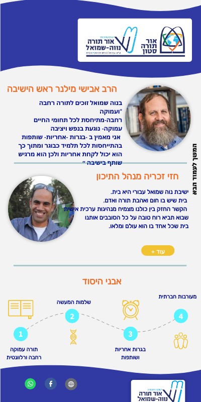 בנוה שמואל זוכים לתורה רחבה ועמוקה"רחבה-מתיחסת לכל תחומי החיים עמוקה- נוגעת בנפש ויציבה אני מאמין ב -בגרות -אחריות- שותפות בהתייחסות לכל תלמיד כבוגר ומתוך כך הוא יכול לקחת אחריות ולכן הוא מרגיש שותף בישיבה ״