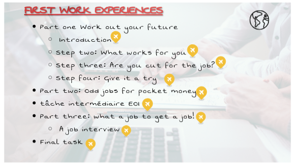 Read the mind map and guess the meaning of the following words: 1…………………..are activities like babysitting and repairing things, etc. 2…………………………………………………..are in addition to academic work at school. 3. An ………………………………..is a candidate for a job. 4.An……………………………is when you learn a job under the supervision of an experienced person. 5.You are ……………………………………………………………when you have all the qualities necessary to do this job. 6.When you ……………………………………………………………………, you like it very much 8.A…………………………………………………………is a short period in a company to give an idea what a particular job is.