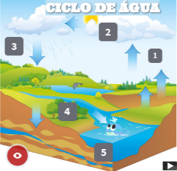 Imagem interativa em que representa o ciclo da água com imagens, vídeo e textos.