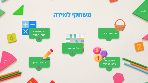 הוראות:-כל משתתף בוחר סימן ( איקס, עיגול וכדו') או דסקית צבעונית. ניתן לעשות עם כלי הAnnotate בזום.-כל משתתף בוחר בתורו שני מספרים מתוך הסל ומחבר אותם.-אם הסכום שקיבל נמצא בלוח – הוא מסמן אותו בסימן שלו.המנצח – מי שסימן ראשון טור, שורה או אלכסון.