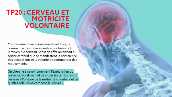 Contrairement aux mouvements réflexes, la commande des mouvements volontaires fait intervenir le cerveau : c'est en effet au niveau du cortex cérébral que se manifestent la conscience des perceptions et la volonté de commander des mouvements. On cherche à savoir comment l'exploration du cortex cérébral permet de situer les territoires du cerveau à l'origine de la motricité volontaire et de quelles cellules se compose le cerveau.