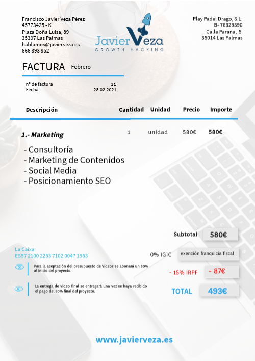 Francisco Javier Veza Pérez45773425 - KPlaza Doña Luisa, 8935307 Las Palmas hablamos@javierveza.es 666 393 952