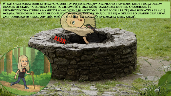 Witaj! spacerujesz sobie letnim popołudniem po lesie, podziwiasz piękno przyrody, kiedy twoim oczom ukazuje się stara, tajemnicza studnia. Ciekawość bierze górę - zaglądasz do niej. Okazuje się, że średniowieczna studnia ma nie tylko magiczne właściwości. Nagle poczułeś, że jakaś niezwykła siła cię wciąga. Przenosisz sie w czasie do średniowiecznej Europy. znajdujesz się w okresie po upadku cesarstwa zachodniorzymskiego. Aby móc wrócić spowrotem masz do wykonania kilka zadań.