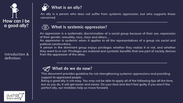 This document provides guideline for not strengthening systemic oppressions and providing support to oppressed people . Being a good ally is not easy. You may not be able to apply all of the following tips all the time, but as you do, it will get easier and easier. Do your best and don't feel guilty if you aren't the perfect ally, our mistakes help us move forward.
