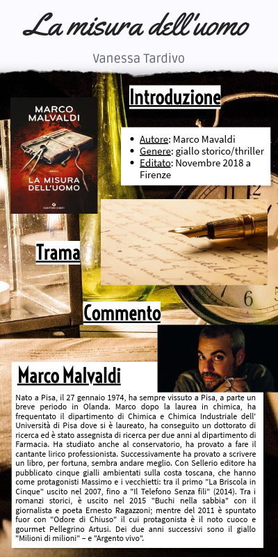 Nato a Pisa, il 27 gennaio 1974, ha sempre vissuto a Pisa, a parte un breve periodo in Olanda. Marco dopo la laurea in chimica, ha frequentato il dipartimento di Chimica e Chimica Industriale dell' Università di Pisa dove si è laureato, ha conseguito un dottorato di ricerca ed è stato assegnista di ricerca per due anni al dipartimento di Farmacia. Ha studiato anche al conservatorio, ha provato a fare il cantante lirico professionista. Successivamente ha provato a scrivere un libro, per fortuna, sembra andare meglio. Con Sellerio editore ha pubblicato cinque gialli ambientati sulla costa toscana, che hanno come protagonisti Massimo e i vecchietti: tra il primo "La Briscola in Cinque" uscito nel 2007, fino a "Il Telefono Senza fili" (2014). Tra i romanzi storici, è uscito nel 2015 "Buchi nella sabbia" con il giornalista e poeta Ernesto Ragazzoni; mentre del 2011 è spuntato fuor con "Odore di Chiuso" il cui protagonista è il noto cuoco e gourmet Pellegrino Artusi. Dei due anni successivi sono il giallo "Milioni di milioni" – e "Argento vivo".