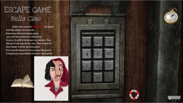 Salut ! mon nom est El Profesor. Je suis le chef des voleurs de la bande.Bienvenue dans cet escape game qui va te faire découvrir Bella Ciao. Tu as vu le coffre fermé par un cadenas. Pour découvrir son secret suis-moi. Mais d'abord il faut réussir à sortir de cette pièce. Si tu es prêt clique sur le livre pour découvrir l'énigme qui te permettra d'ouvrir cette porte