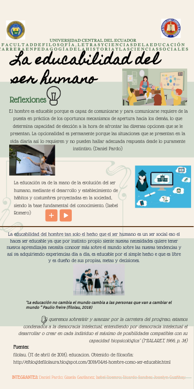 La educabilidad del hombre tan solo el hecho que el ser humano es un ser social eso el haces ser educable ya que por instinto propio siente nuevas necesidades quiere tener nuevos aprendizajes necesita conocer más sobre el mundo sobre las nuevas tendencias y así va adquiriendo experiencias día a día, es educable por el simple hecho e que es libre y es dueño de sus propias, metas y decisiones.