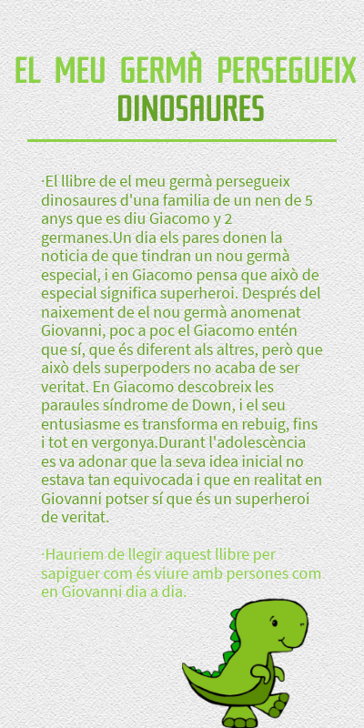 ·El llibre de el meu germà persegueix dinosaures d'una familia de un nen de 5 anys que es diu Giacomo y 2 germanes.Un dia els pares donen la noticia de que tindran un nou germà especial, i en Giacomo pensa que això de especial significa superheroi. Després del naixement de el nou germà anomenat Giovanni, poc a poc el Giacomo entén que sí, que és diferent als altres, però que això dels superpoders no acaba de ser veritat. En Giacomo descobreix les paraules síndrome de Down, i el seu entusiasme es transforma en rebuig, fins i tot en vergonya.Durant l'adolescència es va adonar que la seva idea inicial no estava tan equivocada i que en realitat en Giovanni potser sí que és un superheroi de veritat. ·Hauriem de llegir aquest llibre per sapiguer com és viure amb persones com en Giovanni dia a dia.