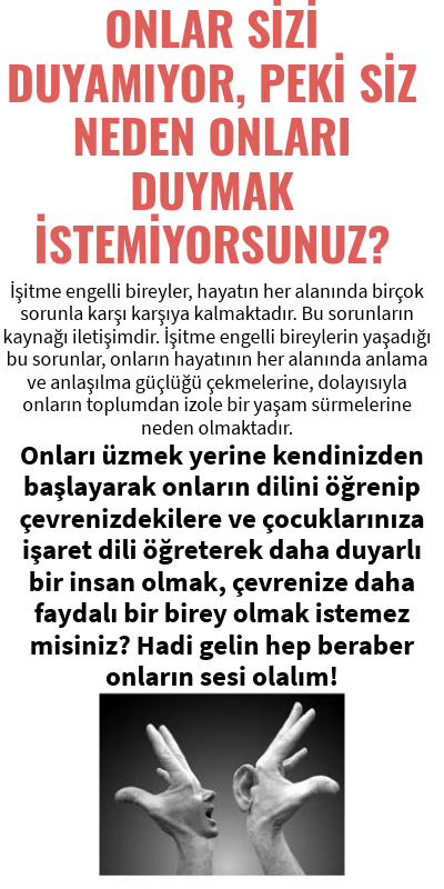 Onları üzmek yerine kendinizden başlayarak onların dilini öğrenip çevrenizdekilere ve çocuklarınıza işaret dili öğreterek daha duyarlı bir insan olmak, çevrenize daha faydalı bir birey olmak istemez misiniz? Hadi gelin hep beraber onların sesi olalım!