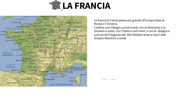 La francia è il terzo paese più grande d'Europa dopo la Russia e l'Ucraina. Confina con il Belgio a nord-ovest, con la Germania e la Svizzera a ovest, con l'Italia a sud-ovest, e con la Spagna a sud-est ed è bagnata dal Mar Mediterraneo a sud e dall' Oceano Atlantico a ovest