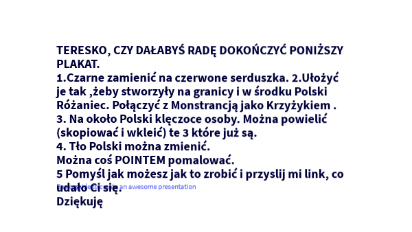 TERESKO, CZY DAŁABYŚ RADĘ DOKOŃCZYĆ PONIŻSZY PLAKAT. 1.Czarne zamienić na czerwone serduszka. 2.Ułożyć je tak ,żeby stworzyły na granicy i w środku Polski Różaniec. Połączyć z Monstrancją jako Krzyżykiem . 3. Na około Polski klęczoce osoby. Można powielić (skopiować i wkleić) te 3 które już są.4. Tło Polski można zmienić. Można coś POINTEM pomalować. 5 Pomyśl jak możesz jak to zrobić i przyslij mi link, co udało Ci się. Dziękuję
