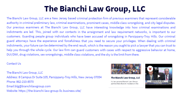 The Bianchi Law Group, LLC are a New Jersey based criminal protection firm of previous examiners that represent considerable authority in criminal preliminary law, criminal examinations, prominent cases, middle class wrongdoing, and city legal disputes. Our previous examiners at The Bianchi Law Group, LLC have interesting knowledge into how criminal examinations and indictments are led. This, joined with our contacts in the arraignment and law requirement networks, is important to our customers. Guarding people group individuals who have been accused of wrongdoing in Parsippany-Troy Hills. Our criminal guard attorneys have the experience and forcefulness that you need to secure your privileges. When dealing with criminal indictments, your future can be determined by the end result, which is the reason you ought to pick a lawyer that you can trust to help you through the whole cycle. Our law firm can guard customers with cases with respect to aggressive behavior at home, DUI/DWI, drug violations, sex wrongdoings, middle class violations, and the sky is the limit from there. Contact Us The Bianchi Law Group, LLC Address: 8 Campus Dr Suite 105, Parsippany-Troy Hills, New Jersey 07054 Phone: 862-210-8570 Email:blg@bianchilawgroup.com Website: https://the-bianchi-law-group-llc.business.site/