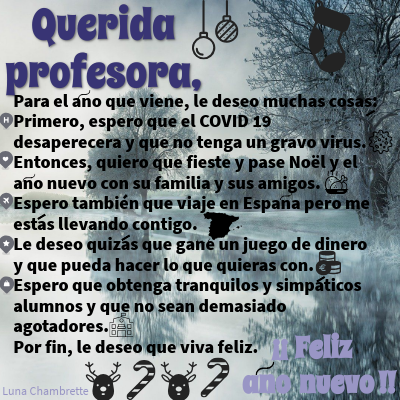 Para el ano que viene, le deseo muchas cosas:Primero, espero que el COVID 19 desaperecera y que no tenga un gravo virus. Entonces, quiero que fieste y pase Noël y el ano nuevo con su familia y sus amigos. Espero también que viaje en Espana pero me estas llevando contigo. Le deseo quizas que gane un juego de dinero y que pueda hacer lo que quieras con. Espero que obtenga tranquilos y simpaticos alumnos y que no sean demasiado agotadores. Por fin, le deseo que viva feliz.
