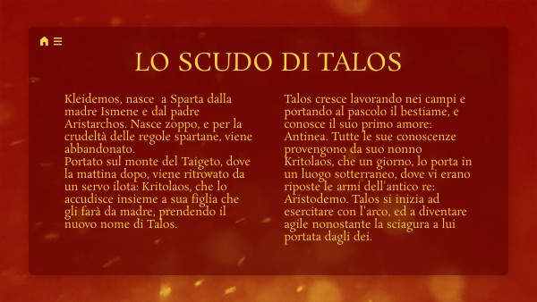 Talos cresce lavorando nei campi e portando al pascolo il bestiame, e conosce il suo primo amore: Antinea. Tutte le sue conoscenze provengono da suo nonno Kritolaos, che un giorno, lo porta in un luogo sotterraneo, dove vi erano riposte le armi dell'antico re: Aristodemo. Talos si inizia ad esercitare con l'arco, ed a diventare agile nonostante la sciagura a lui portata dagli dei.