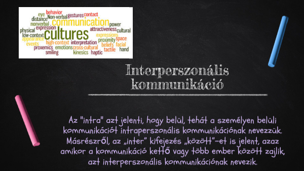 Az "intra" azt jelenti, hogy belül, tehát a személyen belüli kommunikációt intraperszonális kommunikációnak nevezzük. Másrészről, az „inter” kifejezés „között”-et is jelent, azaz amikor a kommunikáció kettő vagy több ember között zajlik, azt interperszonális kommunikációnak nevezik.
