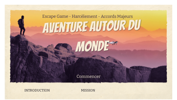 Escape game sur la thématique du harcèlement réalisé par Accords Majeurs. Dans ce jeu tu dois faire le tour du monde à la recherche de chiffres qui constituent un mot de passe. Pour obtenir ces chiffres tu devras répondre à des quiz.