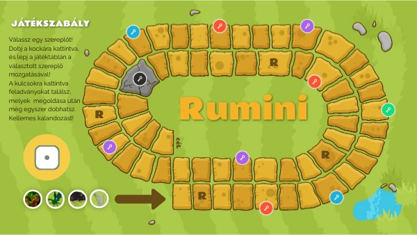 Válassz egy szereplőt! Dobj a kockára kattintva, és lépj a játéktáblán a választott szereplő mozgatásával! A kulcsokra kattintva feladványokat találsz, melyek megoldása után még egyszer dobhatsz. Kellemes kalandozást!