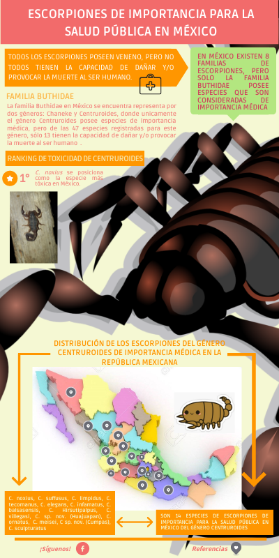 La familia Buthidae en México se encuentra representa por dos géneros: Chaneke y Centruroides, donde unicamente el género Centruroides posee especies de importancia médica, pero de las 47 especies registradas para este género, sólo 13 tienen la capacidad de dañar y/o provocar la muerte al ser humano .