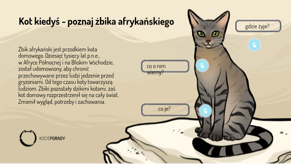 Żbik afrykański jest przodkiem kota domowego. Dziesięć tysięcy lat p.n.e., w Afryce Północnej i na Bliskim Wschodzie, został udomowiony, aby chronić przechowywane przez ludzi jedzenie przed gryzoniami. Od tego czasu koty towarzyszą ludziom. Żbiki pozostały dzikimi kotami, zaś kot domowy rozprzestrzenił się na cały świat. Zmienił wygląd, potrzeby i zachowania.