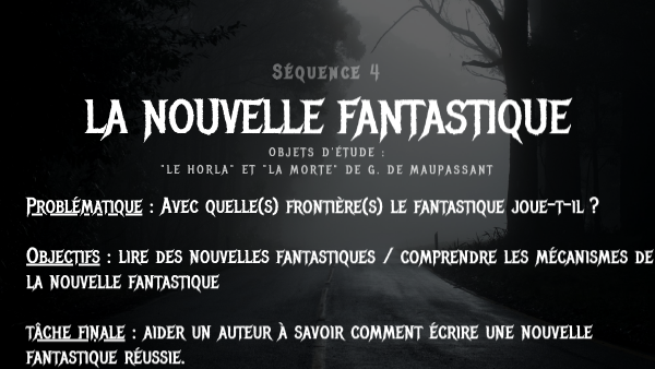 Problématique : Avec quelle(s) frontière(s) le fantastique joue-t-il ? Objectifs : lire des nouvelles fantastiques / comprendre les mécanismes de la nouvelle fantastique tâche finale : aider un auteur à savoir comment écrire une nouvelle fantastique réussie.