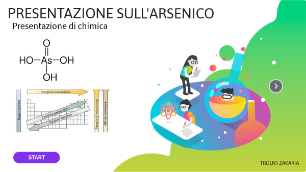 L'Arsenico è un semimetallo che si presenta in tre forme diverse: gialla, nera e grigia. ila sua massa atomica è 74,92160 u. La configurazione elettronica dell'arsenico è [Ar]3d10 4s2 4p3 Isuoi livelli energetici sono 2, 8, 18, 5