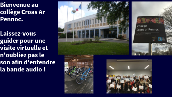 Bienvenue au collège Croas Ar Pennoc. Laissez-vous guider pour une visite virtuelle et n'oubliez pas le son afin d'entendre la bande audio !