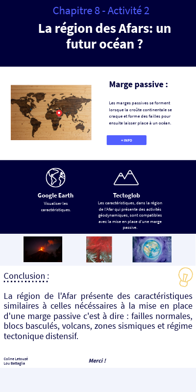 Conclusion :La région de l'Afar présente des caractéristiques similaires à celles nécéssaires à la mise en place d'une marge passive c'est à dire : failles normales, blocs basculés, volcans, zones sismiques et régime tectonique distensif.