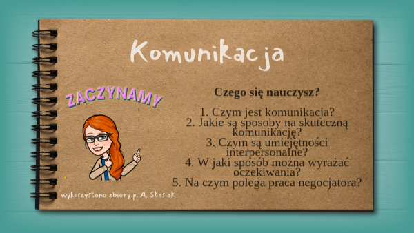 Czego się nauczysz?1. Czym jest komunikacja? 2. Jakie są sposoby na skuteczną komunikację? 3. Czym są umiejętności interpersonalne? 4. W jaki sposób można wyrażać oczekiwania? 5. Na czym polega praca negocjatora?
