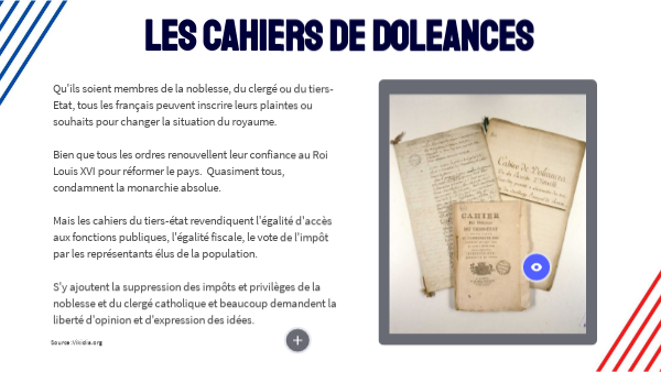 Qu'ils soient membres de la noblesse, du clergé ou du tiers-Etat, tous les français peuvent inscrire leurs plaintes ou souhaits pour changer la situation du royaume. Bien que tous les ordres renouvellent leur confiance au Roi Louis XVI pour réformer le pays. Quasiment tous, condamnent la monarchie absolue. Mais les cahiers du tiers-état revendiquent l'égalité d'accès aux fonctions publiques, l'égalité fiscale, le vote de l'impôt par les représentants élus de la population. S'y ajoutent la suppression des impôts et privilèges de la noblesse et du clergé catholique et beaucoup demandent la liberté d'opinion et d'expression des idées.