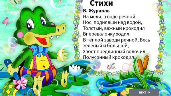 В. Журавль На мели, в воде речной Нос, поднявши над водой, Толстый, важный крокодил Вперевалочку ходил. В тёплой заводи речной, Весь зеленый и большой, Хвост предлинный волочил Полусонный крокодил.
