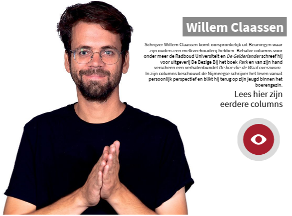 Schrijver Willem Claassen komt oorspronkelijk uit Beuningen waar zijn ouders een melkveehouderij hebben. Behalve columns voor onder meer de Radboud Universiteit en De Gelderlander schreef hij voor uitgeverij De Bezige Bij het boek Park en van zijn hand verscheen een verhalenbundel De koe die de Waal overzwom. In zijn columns beschouwt de Nijmeegse schrijver het leven vanuit persoonlijk perspectief en blikt hij terug op zijn jeugd binnen het boerengezin.