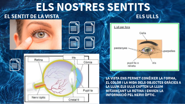 LA VISTA ENS PERMET PERCEBRE LA FORMA I EL COLOR DELS OBJECTES,TANT DELS PROPERS COM DELS LLUNYANS. L'ORGAN DEL SENTIT DE LA VISTA SÓN ELS ULLS.