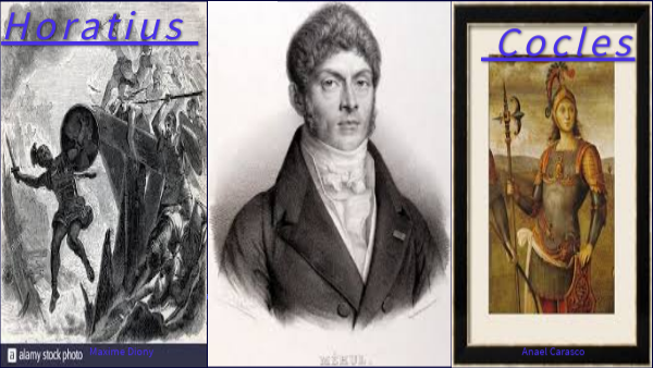 Guerre entre Rome et le puissant roi étrusque de Clusium, Porsenna Trois héros: Mucius Scaevola, Clélie et Horatius Coclès Horatius Coclès surnom de « Coclès » (borgne) perte d'un œil. Les Étrusques mettent en déroute les Romains et pénétrent dans Rome Horatius interdit le passage du pont Sublicius, seul ou avec deux compagnons Le pont détruit sur son ordre, il se serait dans le Tibre où il aurait trouvé la mort , d'autres qu'il est indemne ou blessé À la suite de cet exploit, le peuple l'auraient honoré, en le nourrissant gratuitement et en lui construisant une statut de lui