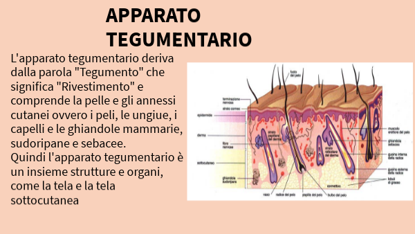L'apparato tegumentario deriva dalla parola "Tegumento" che significa "Rivestimento" e comprende la pelle e gli annessi cutanei ovvero i peli, le ungiue, i capelli e le ghiandole mammarie, sudoripane e sebacee. Quindi l'apparato tegumentario è un insieme strutture e organi, come la tela e la tela sottocutanea
