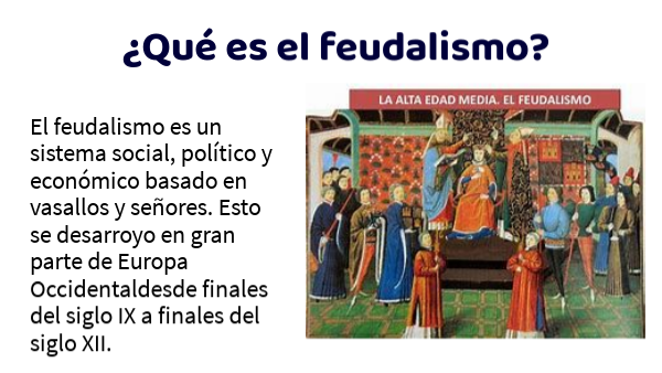 El feudalismo es un sistema social, político y económico basado en vasallos y señores. Esto se desarroyo en gran parte de Europa Occidentaldesde finales del siglo IX a finales del siglo XII.
