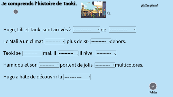 Hugo, Lili et Taoki sont arrivés à de . Le Mali a un climat : plus de 30 dehors.Taoki se mal. Il . Il rêve . Hamidou et son portent de jolis multicolores. Hugo a hâte de découvrir la .